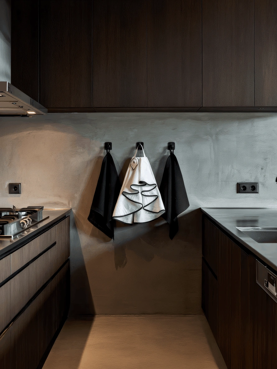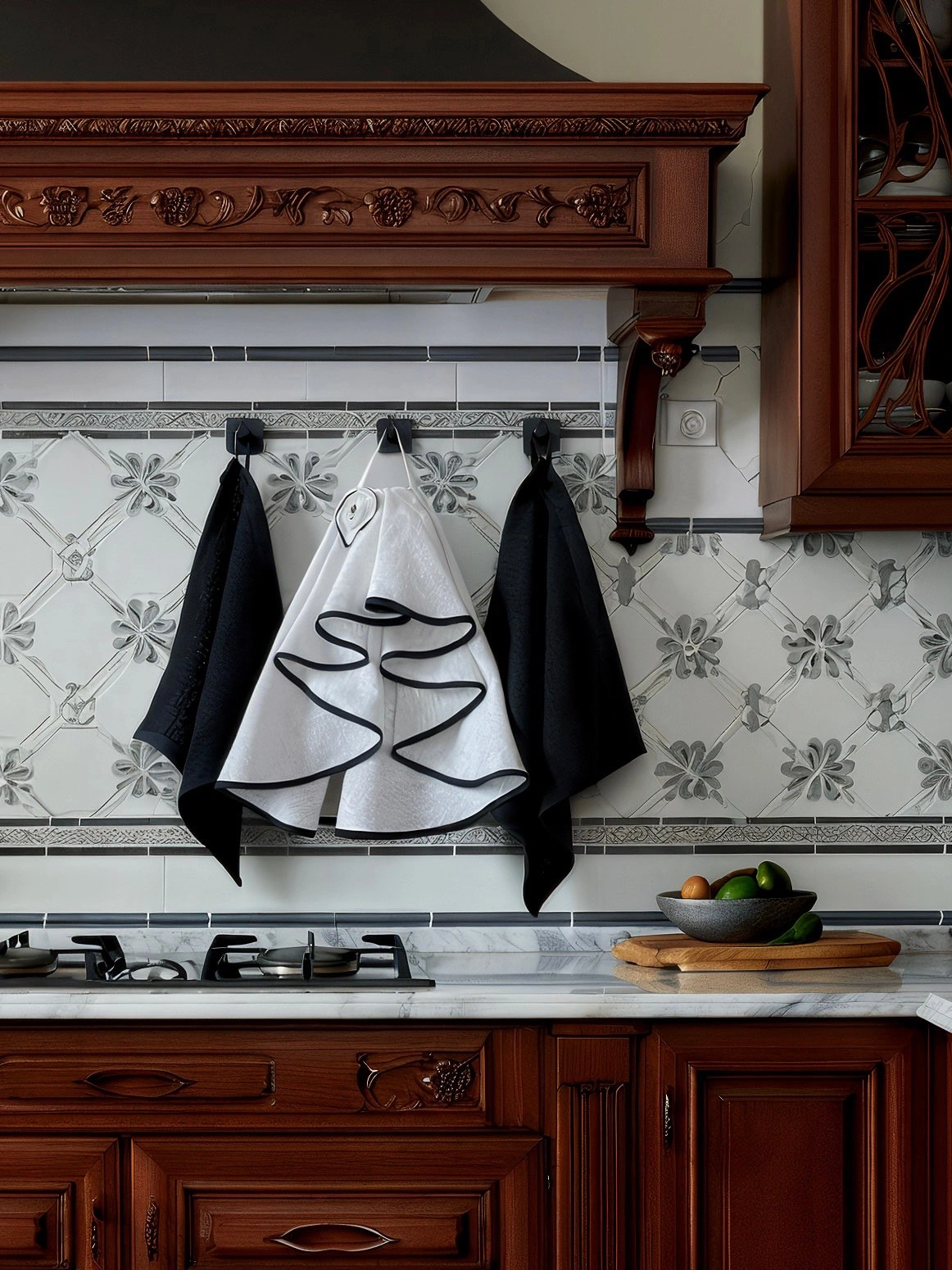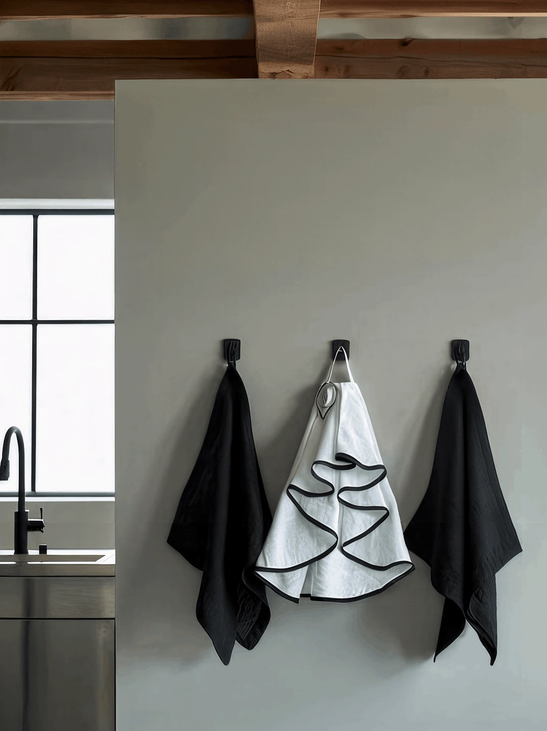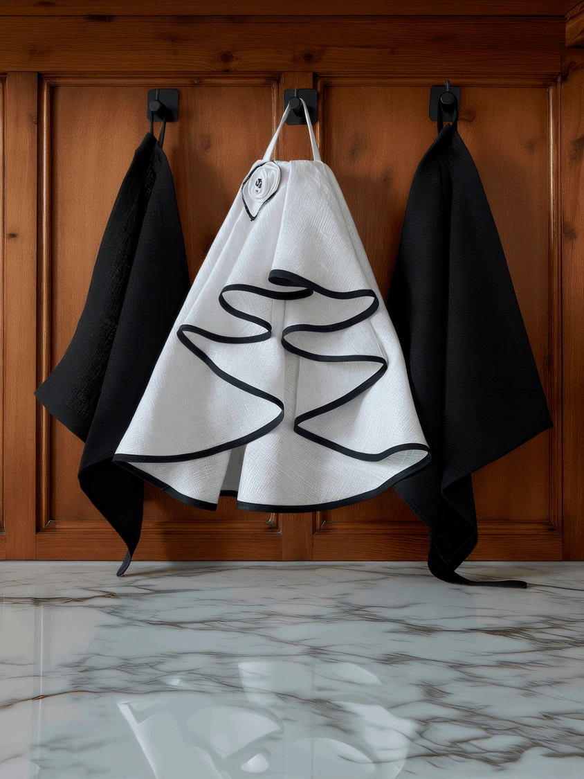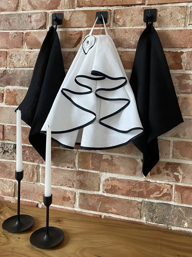 Представляем эксклюзивный набор полотенец, который станет центральным арт-объектом в вашей кухне или столовой. Это не просто текстиль, а произведение дизайнерского искусства, сочетающее чистоту натурального белого льна и драматизм глубокого черного. Идеально для интерьеров в стиле минимализм, лофт или современная классика.