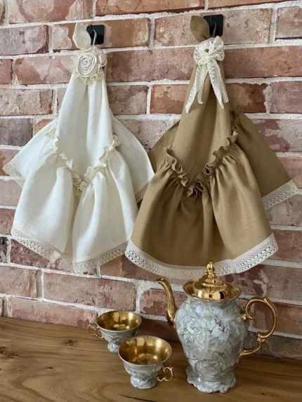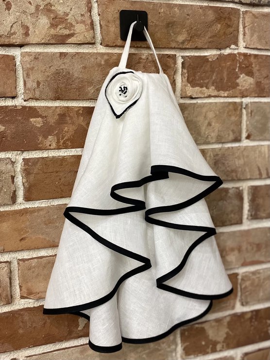 Стильные Оборки: Полотенца выполнены в виде многослойных воланов с черной каймой, что придает им вид элегантного платья.