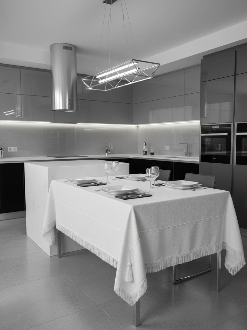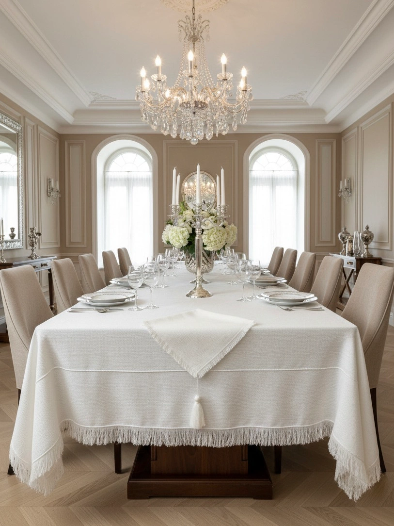 | Объемная Бахрома | Края скатерти обработаны пышной, распущенной бахромой (fringe), которая придает изделию мягкость и завершенность. |