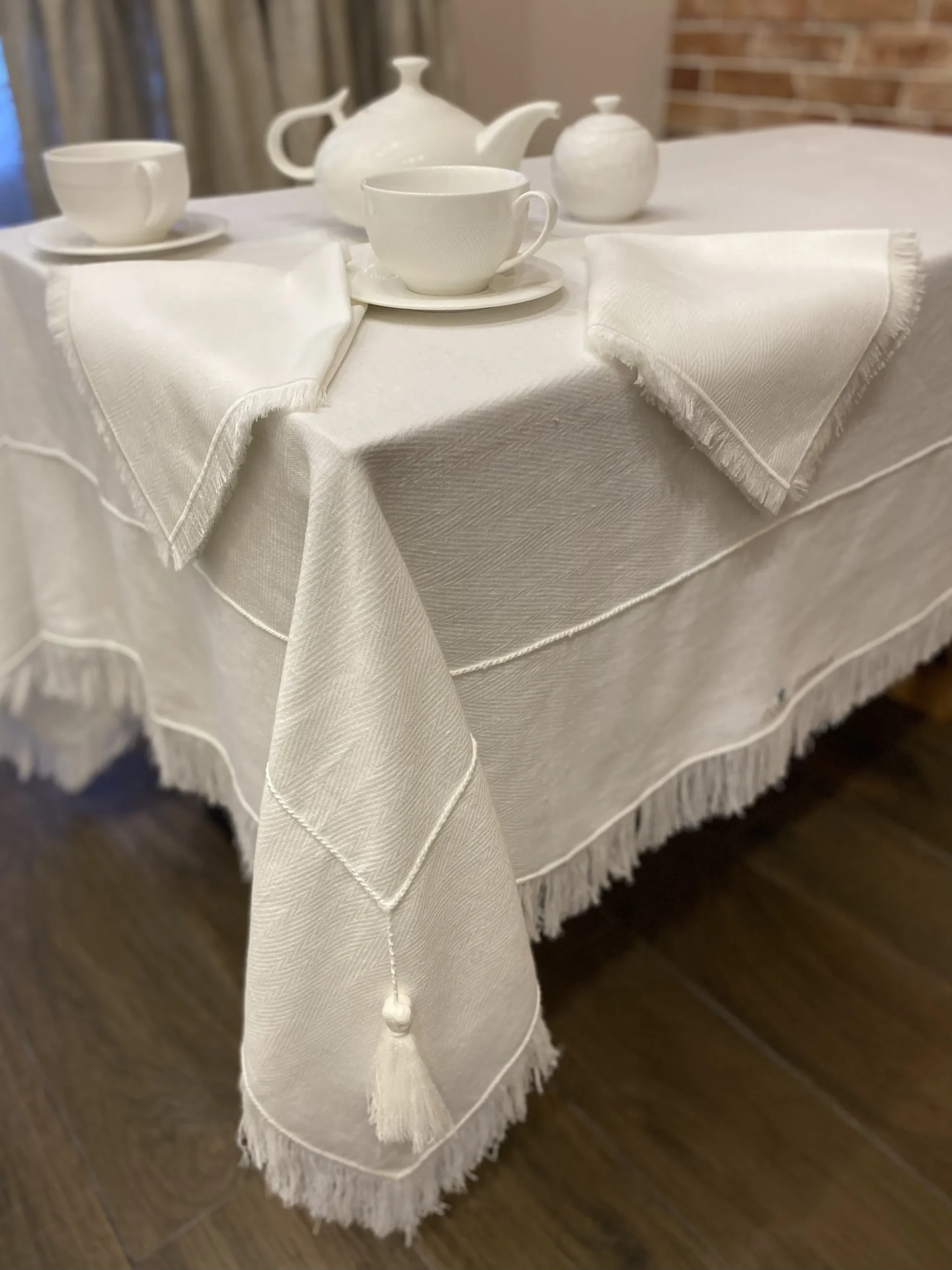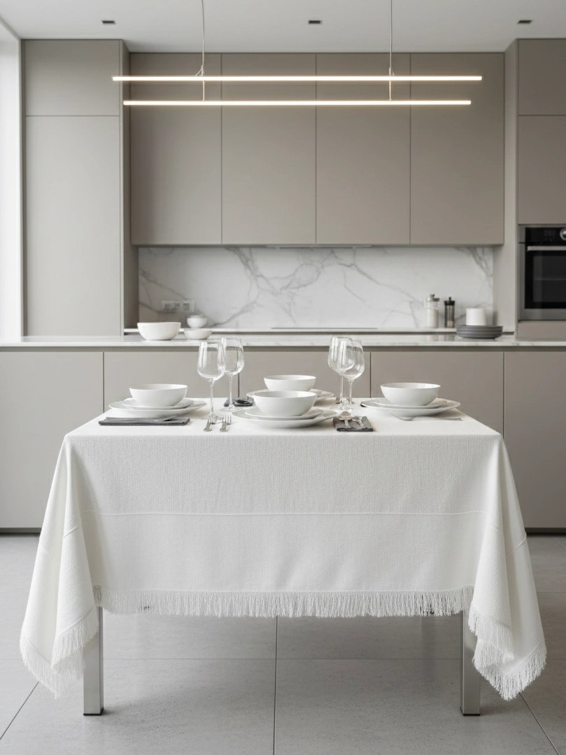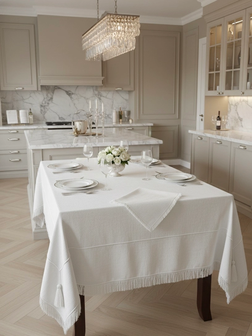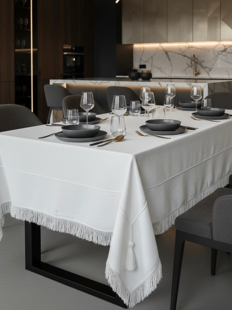 ✨ Чистая Роскошь: Скатерть Ручной Работы с Бахромой и Вышивкой