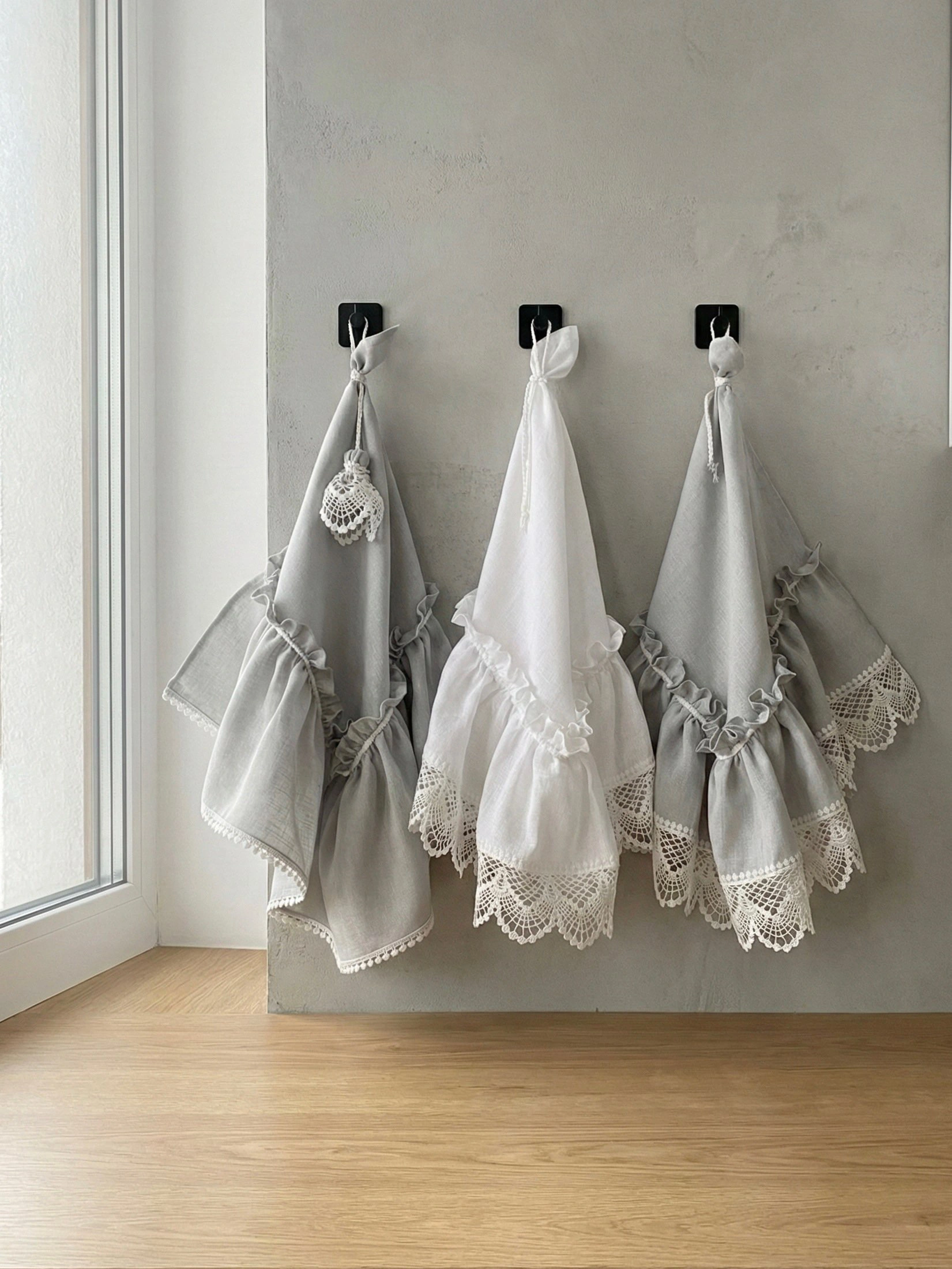 • Романтичный Дизайн: Каждое полотенце имеет пышный, многослойный крой с объемными рюшами (воланами), создающими эффект легкого облака.
