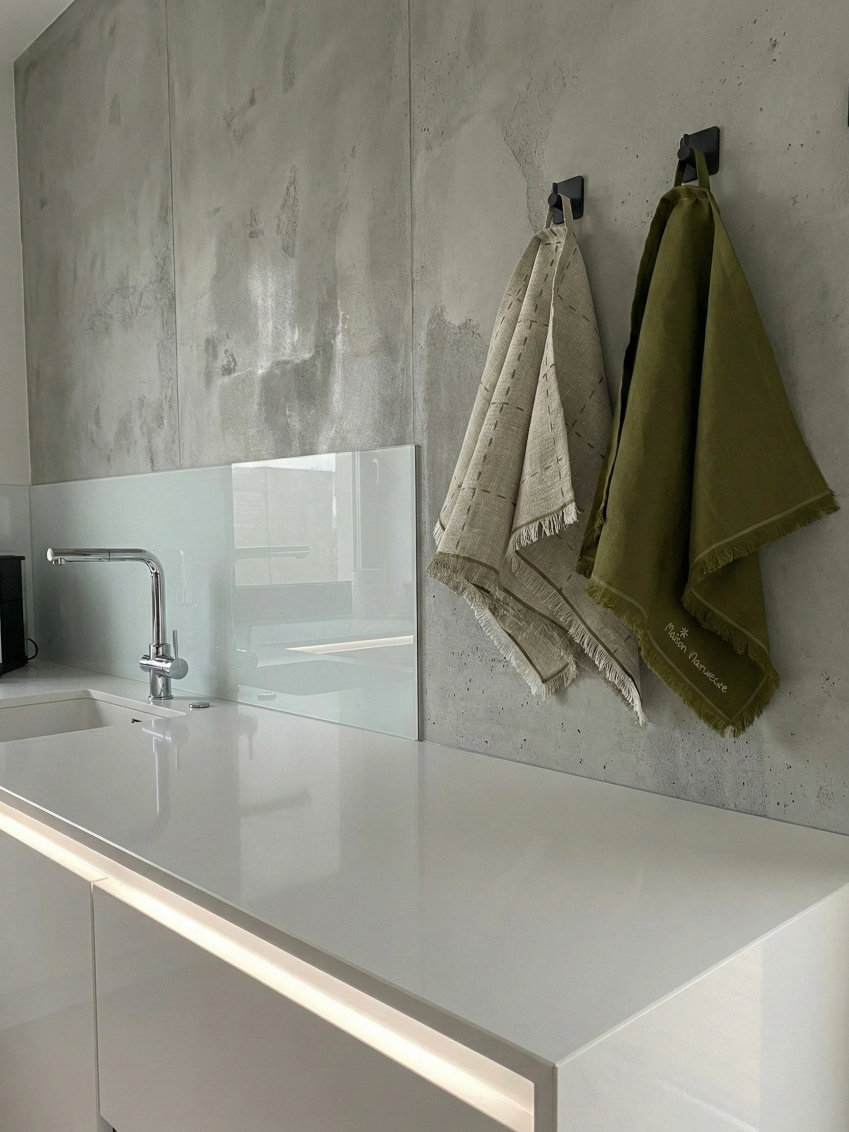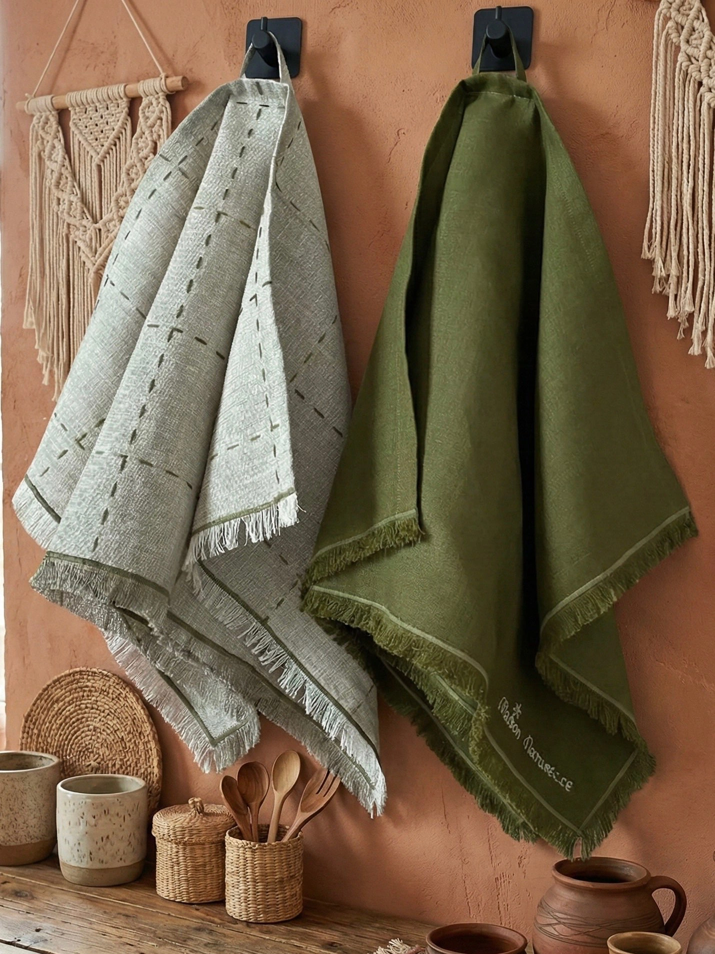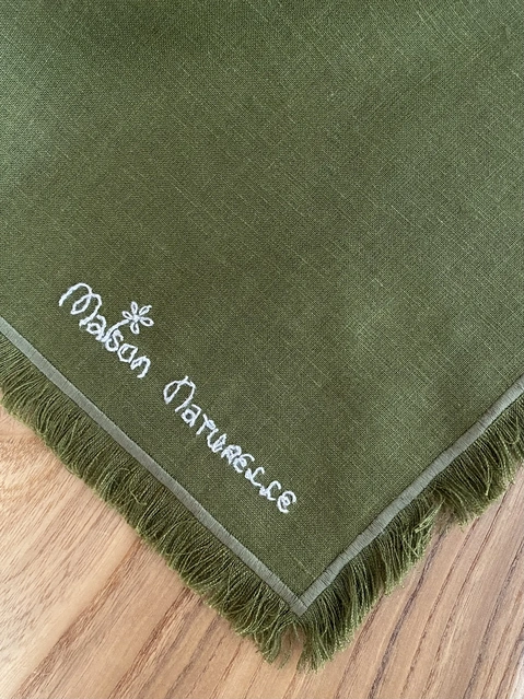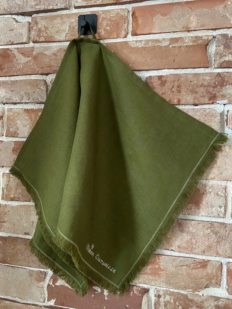 Фирменная Вышивка: На оливковом полотенце нанесена изящная ручная вышивка бренда Maison Naturelle, что подтверждает эксклюзивный статус и оригинальность изделия.