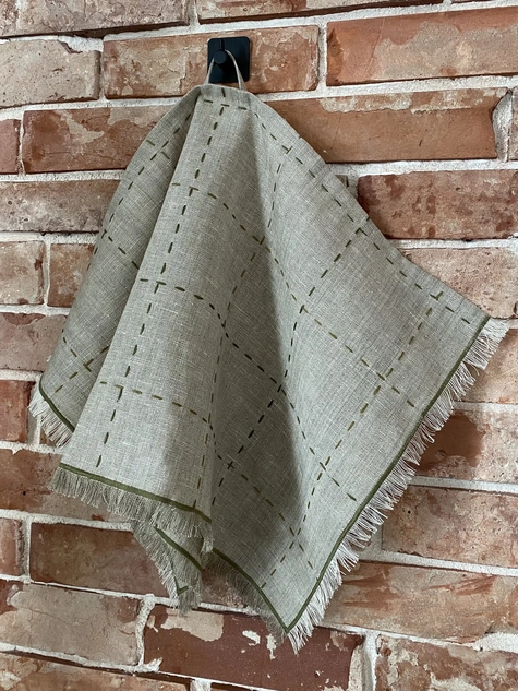 | Ручная Прошивка | Натуральное полотенце украшено ручной декоративной строчкой (пунктиром) оливкового цвета, образующей крупную клетку. Эта деталь придает полотенцу уникальную фактуру. |