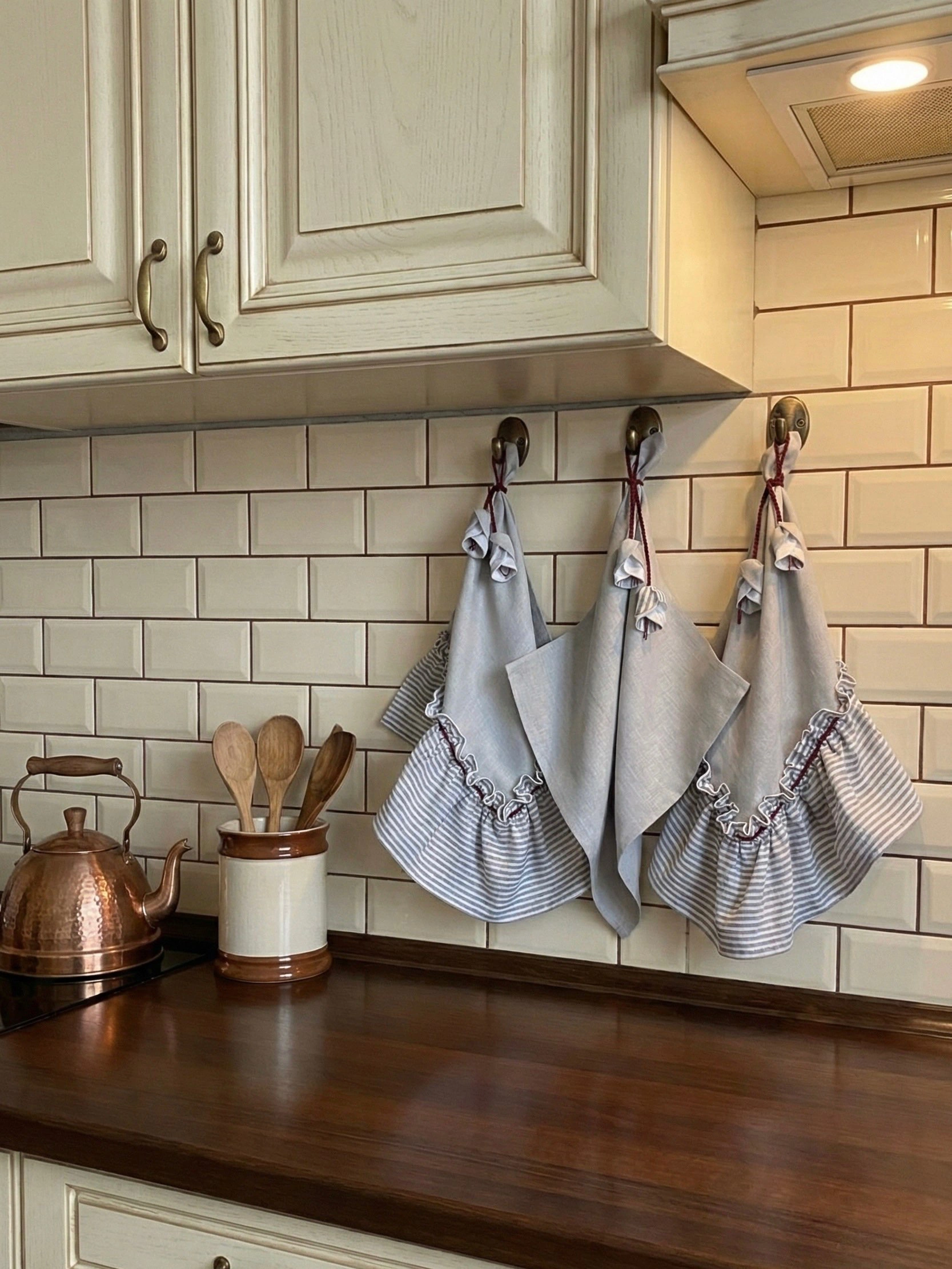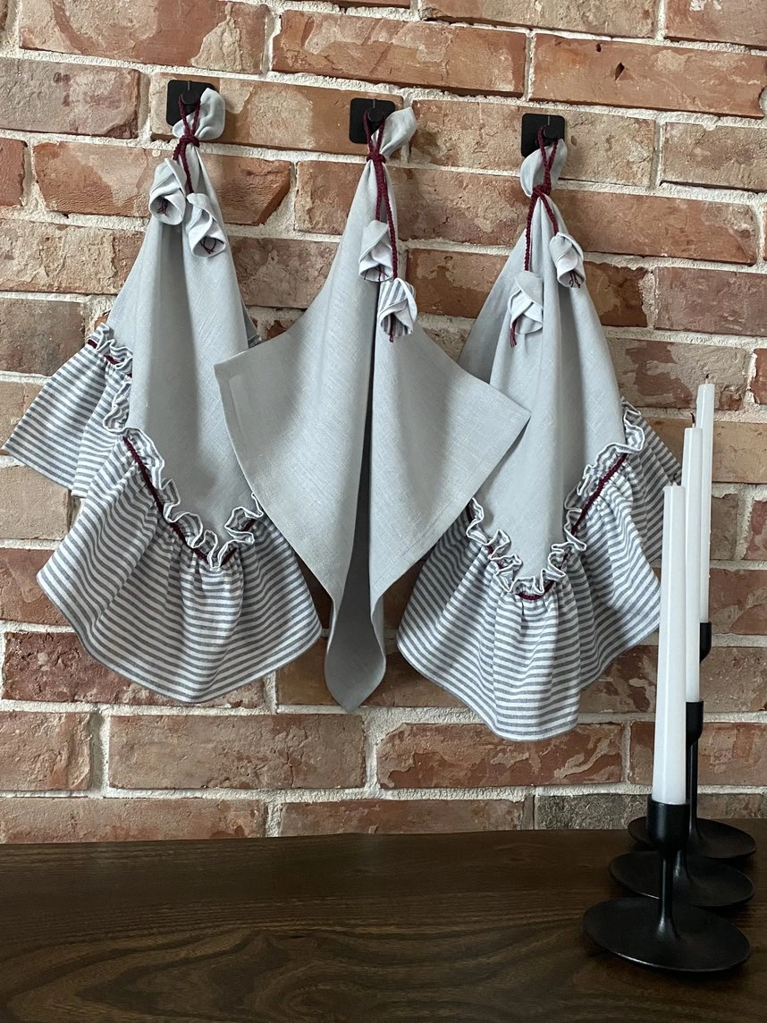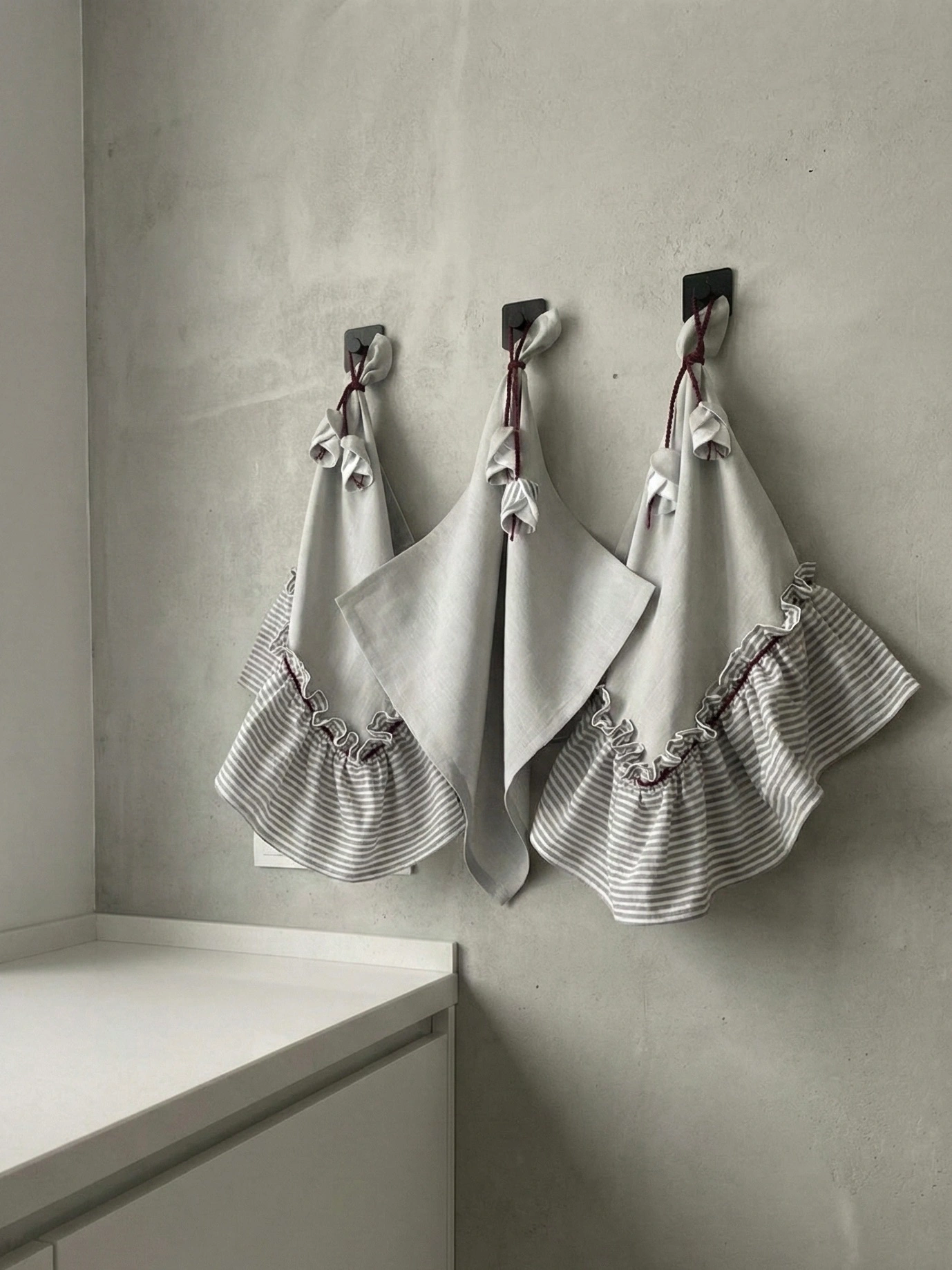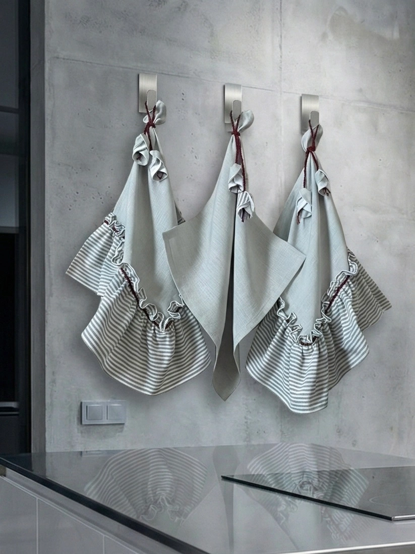 Рюши (Воланы) Два полотенца украшены широкими, пышными воланами из полосатого льна, создающими эффект нарядной «юбки».