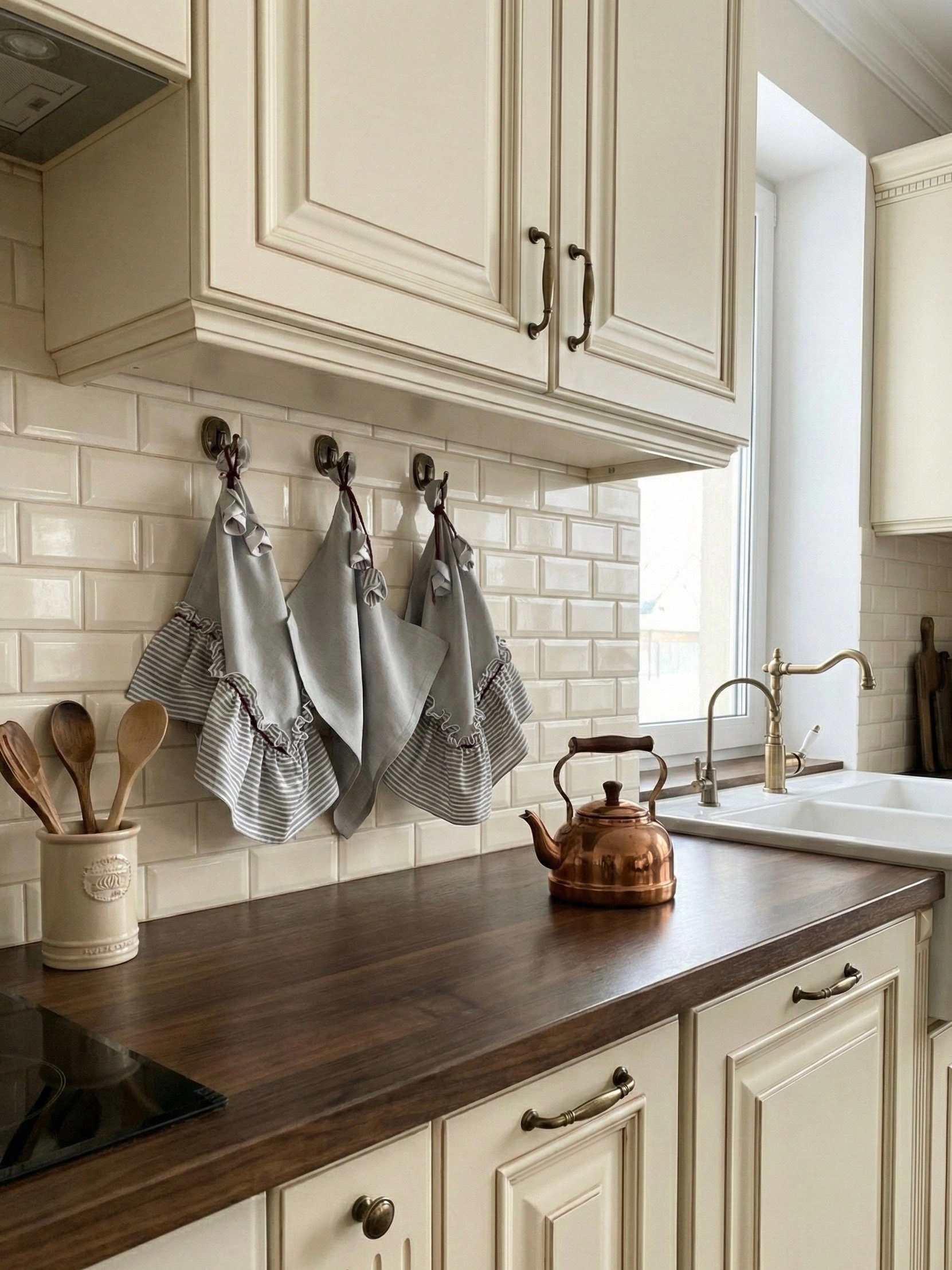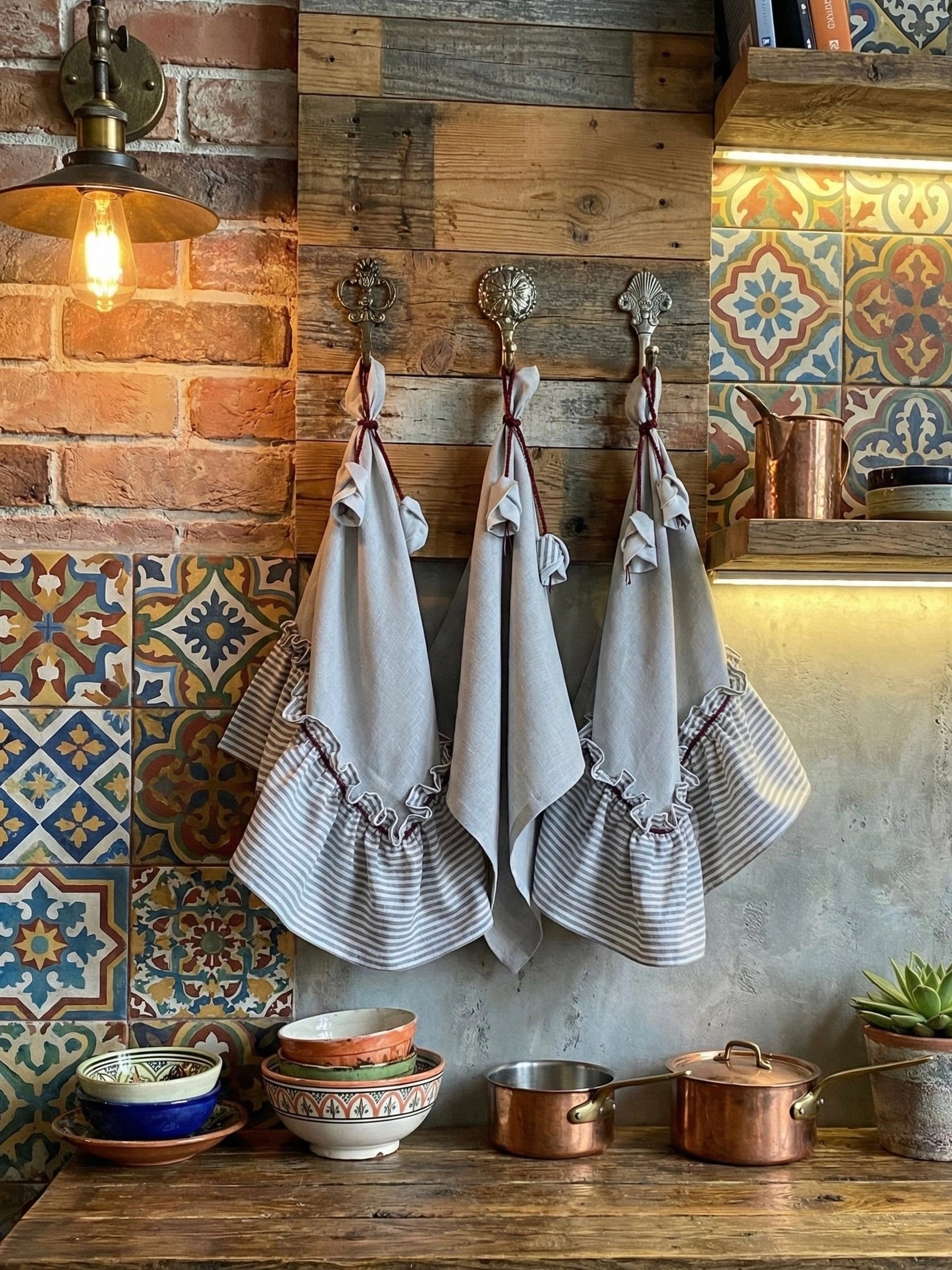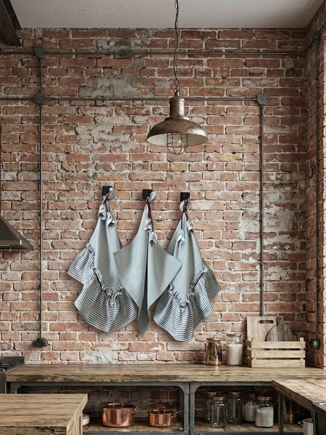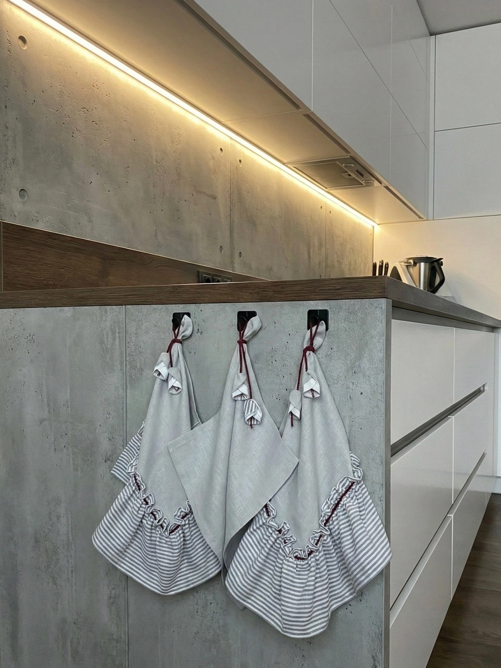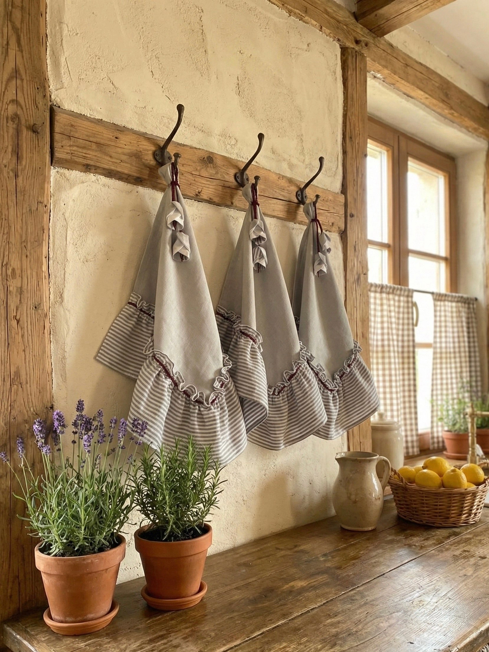 Рюши (Воланы) Два полотенца украшены широкими, пышными воланами из полосатого льна, создающими эффект нарядной «юбки».