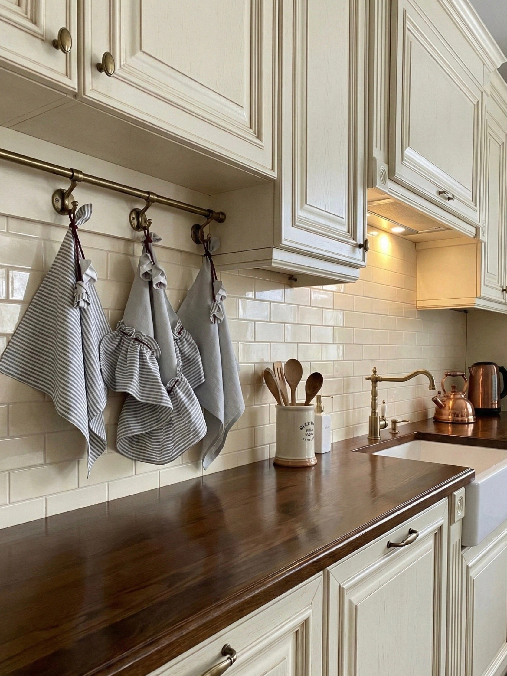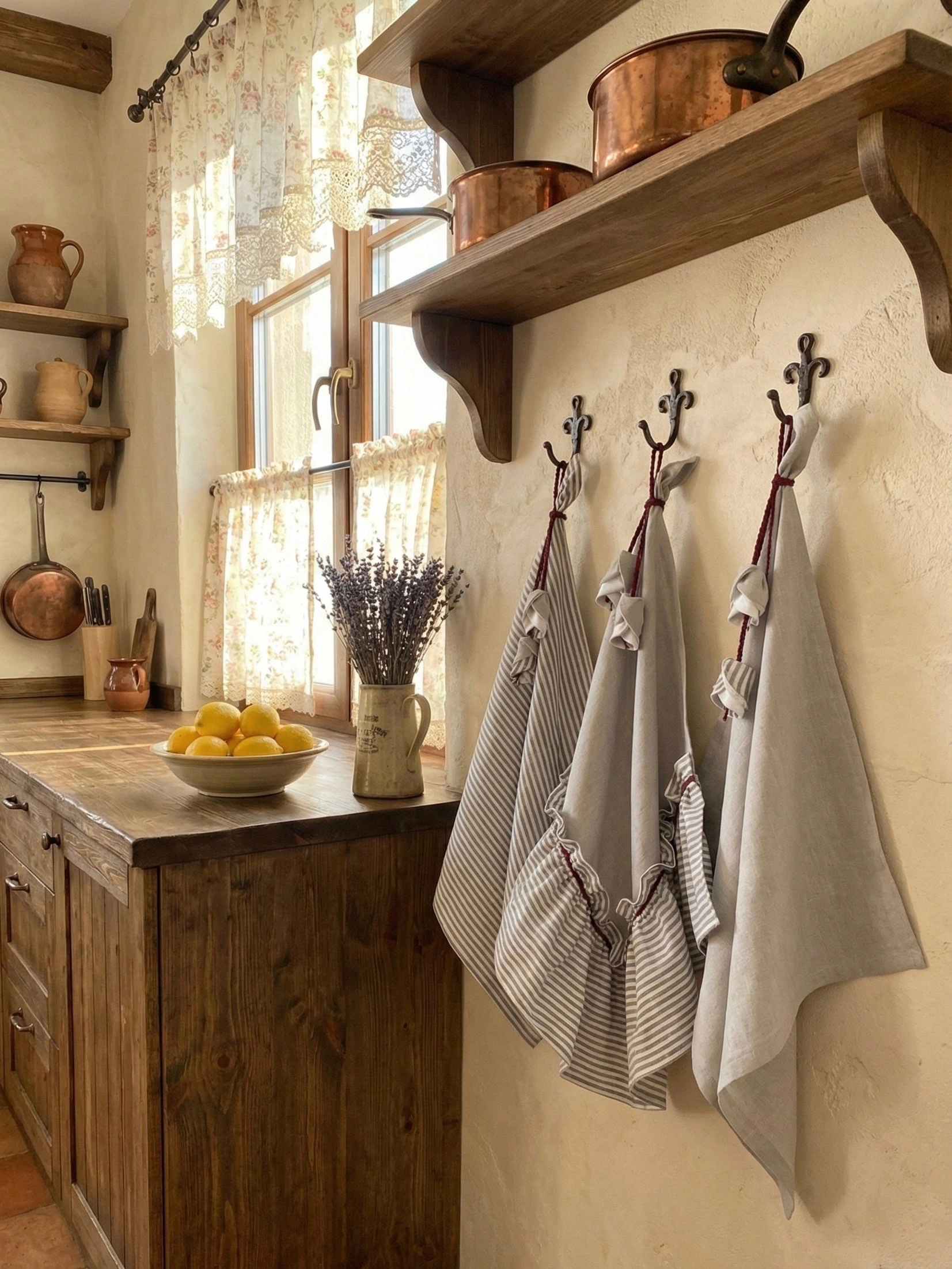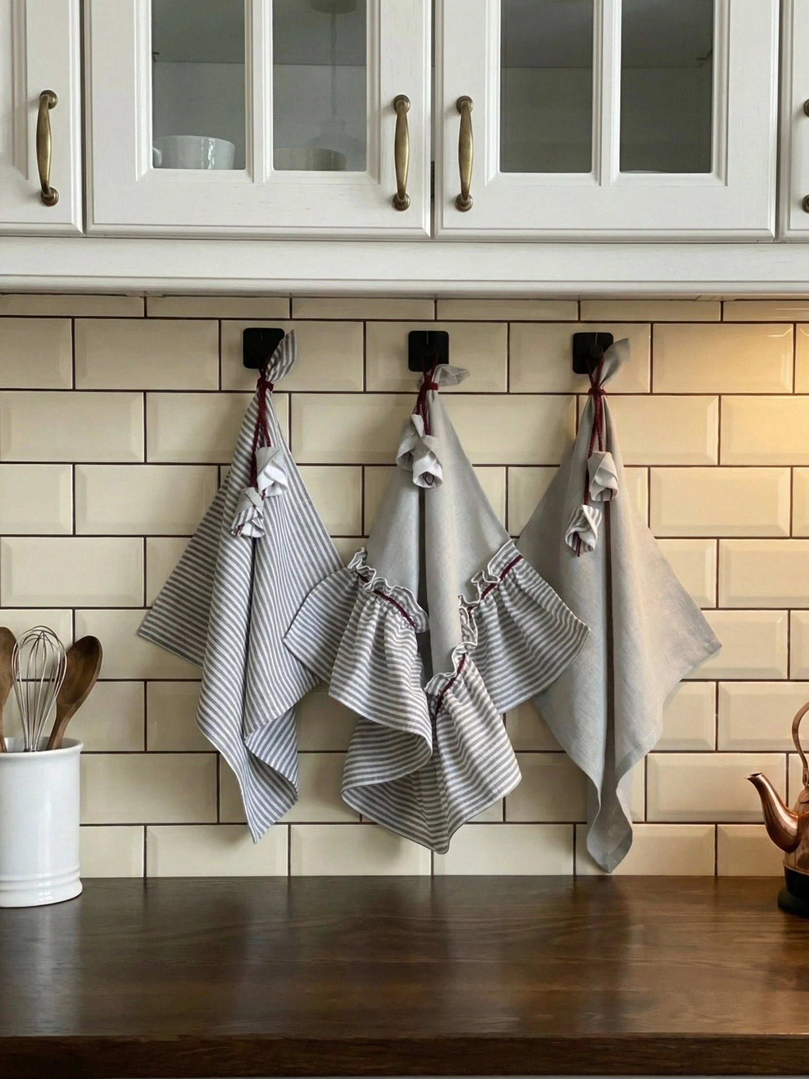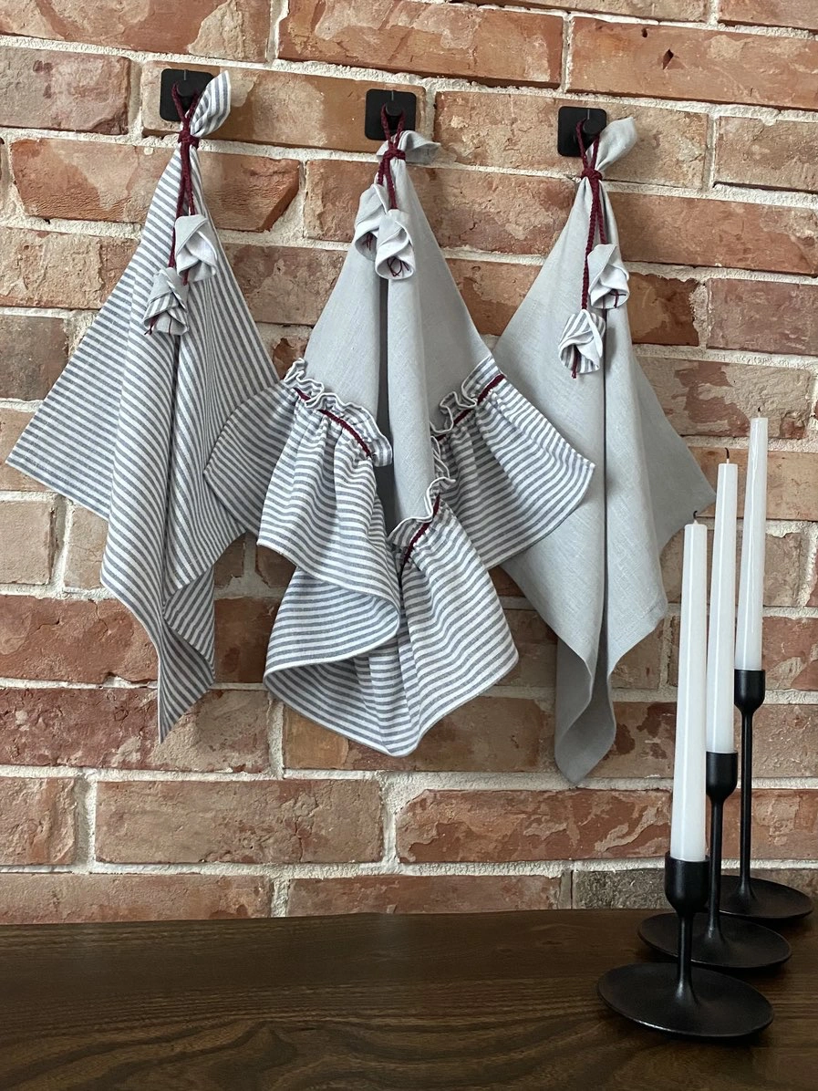 🧵 Общие Детали: Все полотенца украшены декоративными льняными бутонами (или стилизованными цветками) и подвешиваются на витой бордовый шнур, что подчеркивает их ручную работу и комплектность.