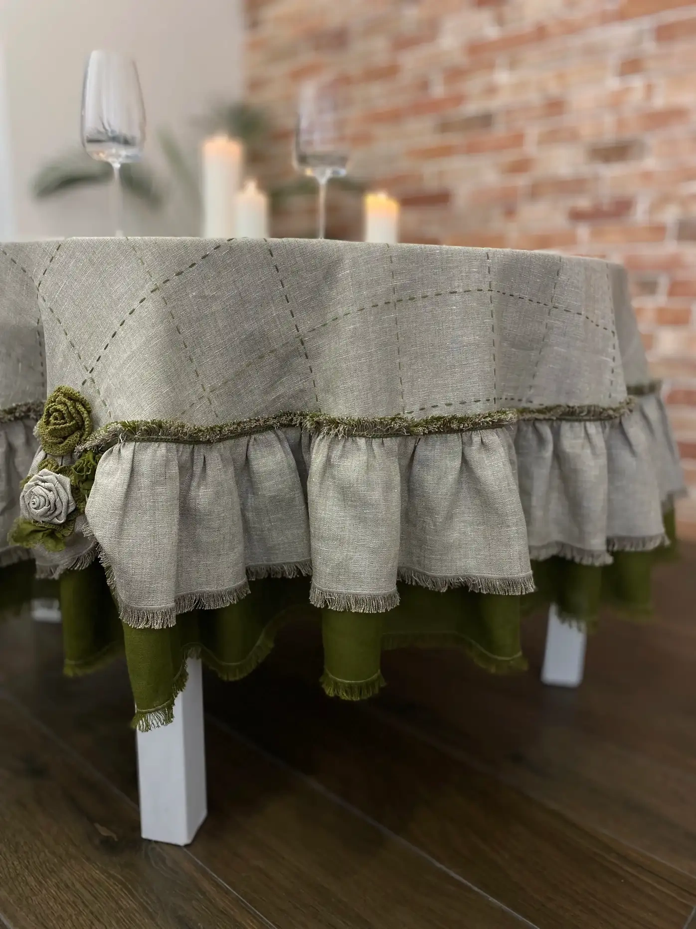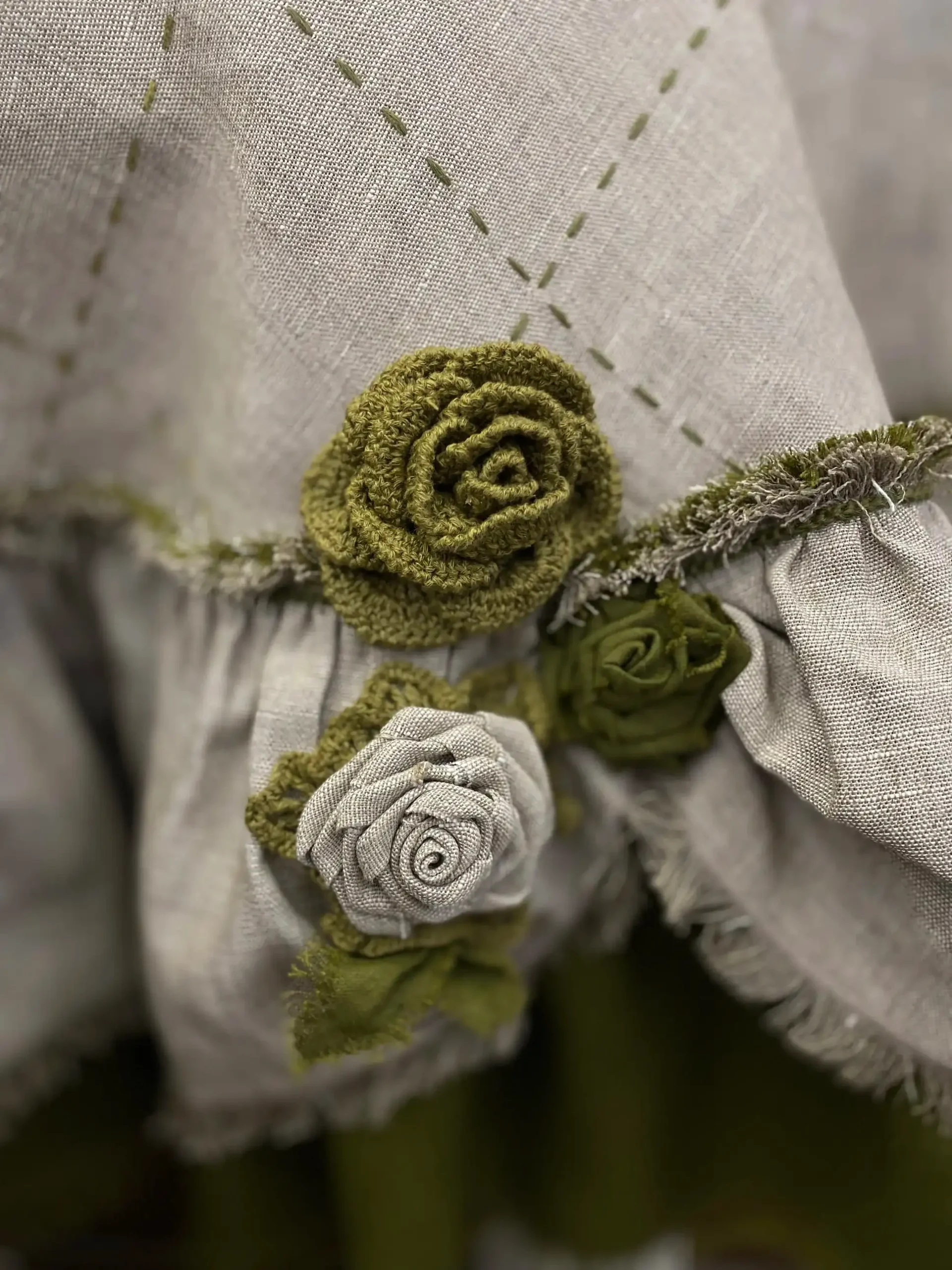 | 3D-Аппликация | Скатерть украшена объемными розами ручной работы из льняной ткани и вязаных элементов в оттенках грейж и оливковый. Эта цветочная аппликация придает скатерти романтическую роскошь. |