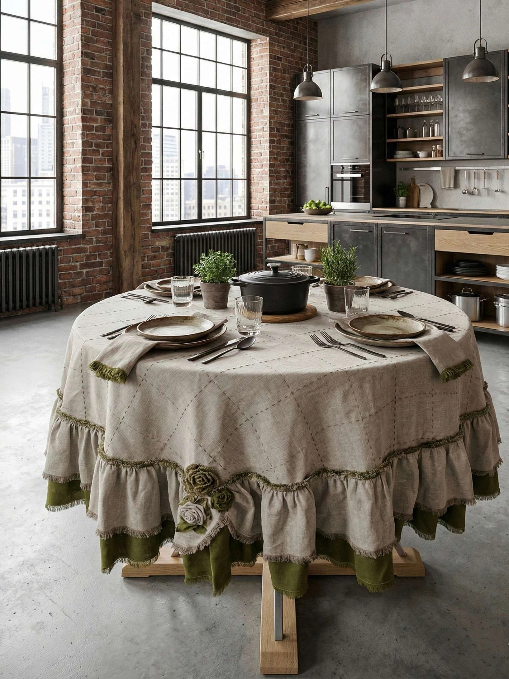 Представляем премиальную льняную скатерть, которая является истинным произведением текстильного искусства. Это изделие сочетает природную красоту натурального льна с изысканным дизайном ручной работы, подчеркивая эксклюзивный и высокий статус вашего дома.